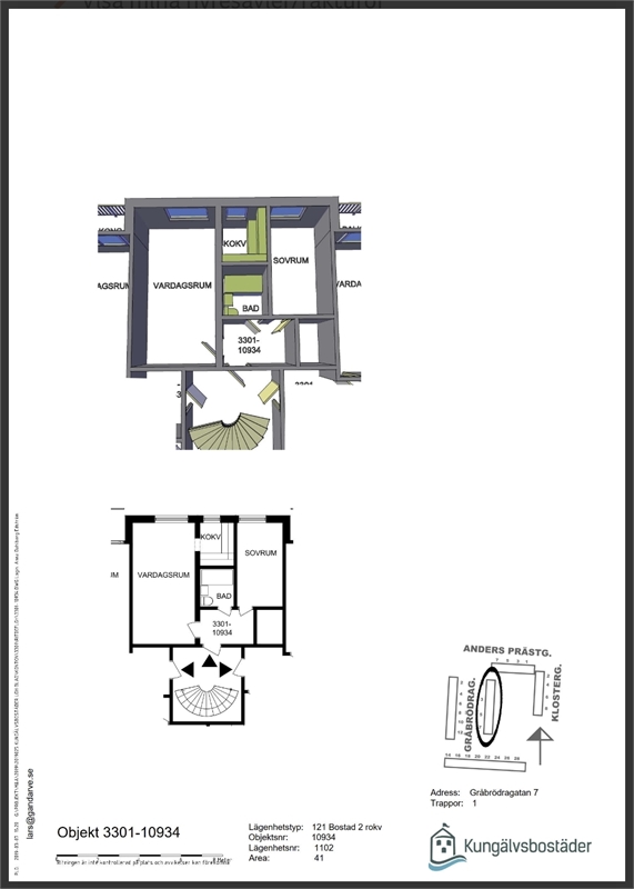 Ljus lägenhet i lugnt område. Lägenheten har stort vardagsrum och sovrum och klädkammare. Dusch och framdraget för tvättmaskin. Tvättstuga och förråd finns i källaren.